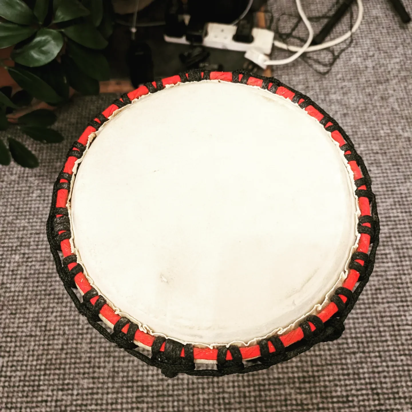 A djembe drum with a wooden base and a beige drumhead, wrapped with black and red rope decorations. with a new drum skin fitted.